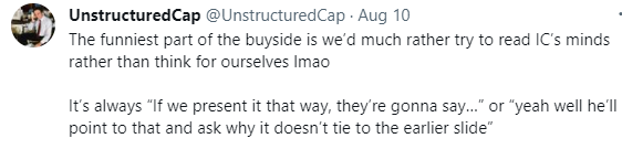 But instead, this late Thursday call required maximum brainpower. We had taken a deal up to IC the day before, and got absolutely shit on. They asked a bunch of detailed “gotcha” questions and I swear you could see the drool falling out of my mouth when I tried to answer. We were caught flatfooted and looked like oafs.